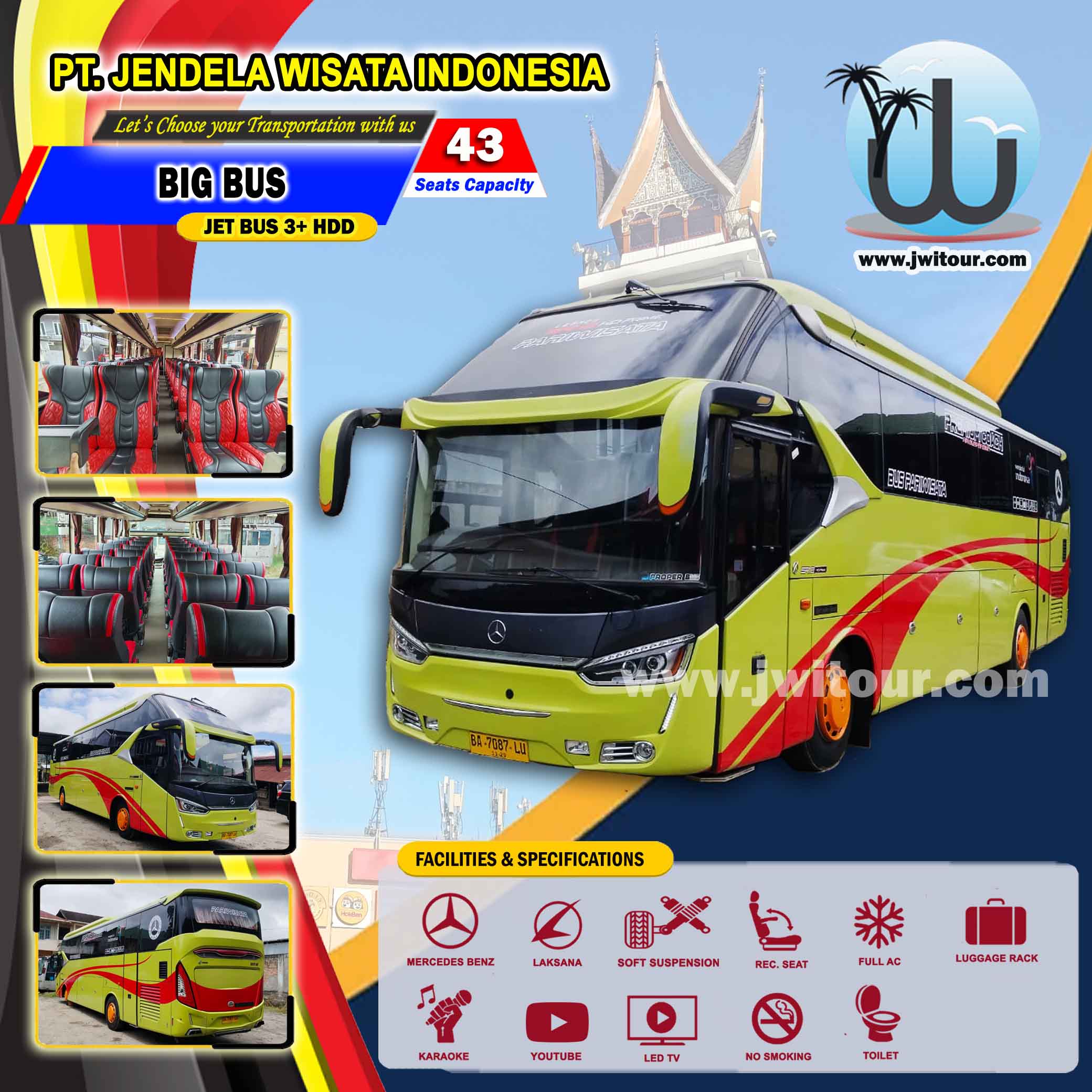Big Bus JETBUS 3+ HDD berkapasitas 43 Seat, Armada ini dilengkapi dengan fasilitas standard Bus Pariwisata dan fasilitas tambahan seperti : Toilet di dalam Cabin Penumpang.