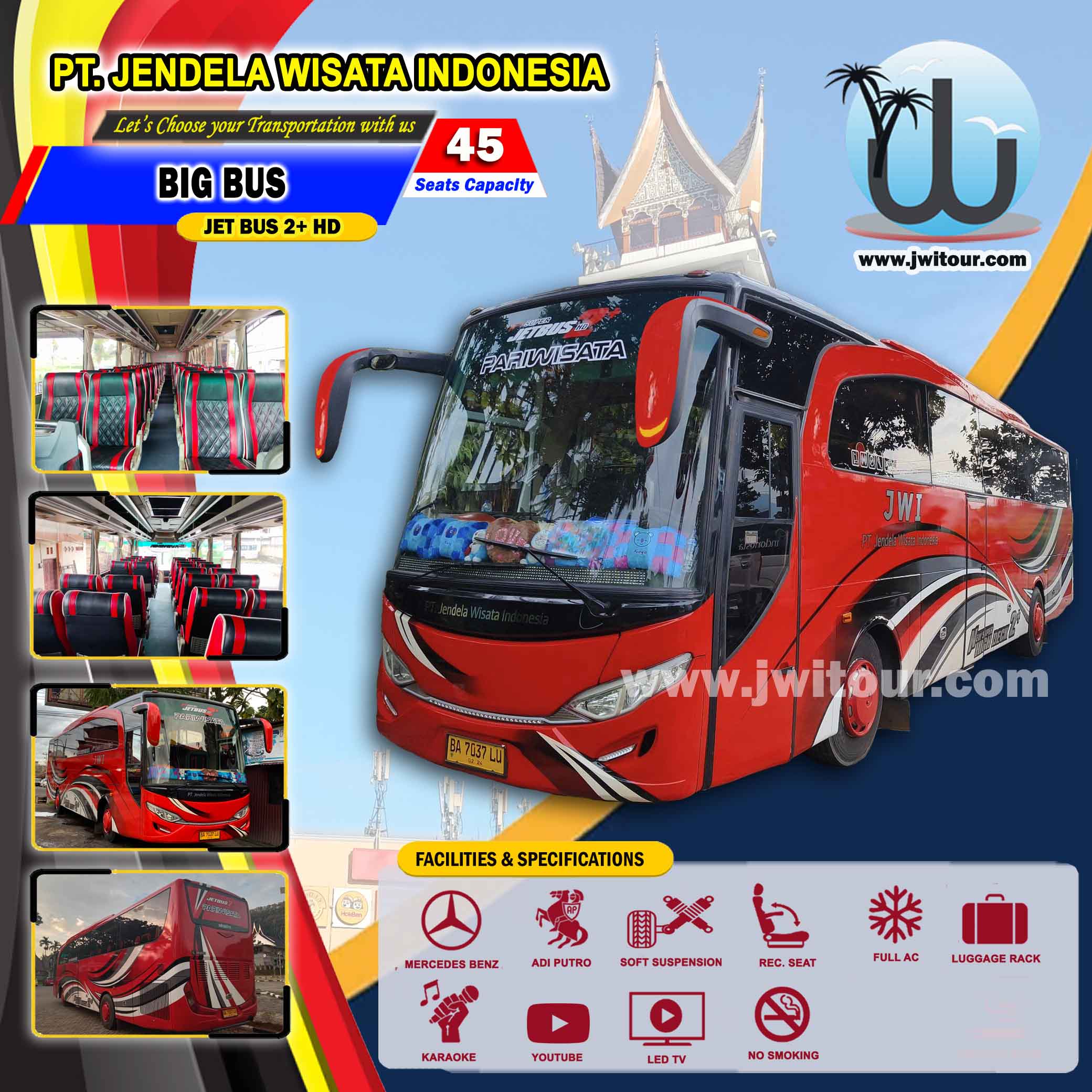 Big Bus JETBUS 2+ HD berkapasitas 45 Seat, Armada ini dilengkapi dengan Fasilitas standard Bus Pariwisata sehingga membuat perjalanan wisata anda lebih berkesan.