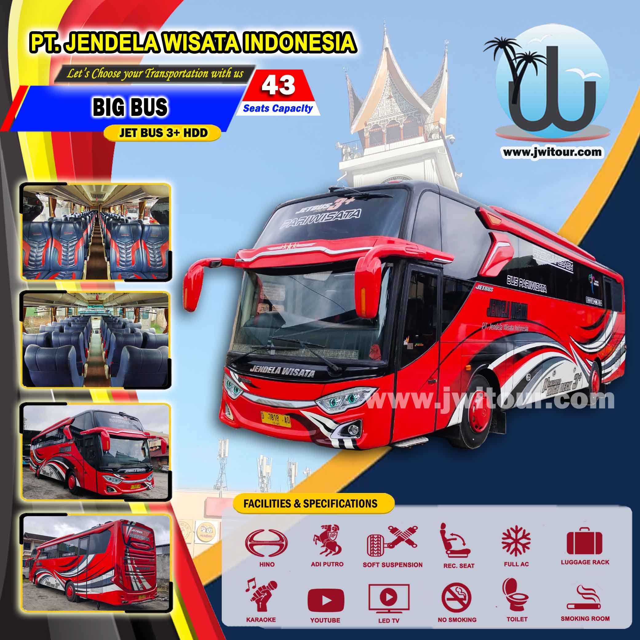 Big Bus JETBUS 3+ HDD berkapasitas 43 Seat, Armada ini dilengkapi dengan fasilitas standard Bus Pariwisata dan fasilitas tambahan seperti : Toilet dan Smoking Room di dalam Cabin