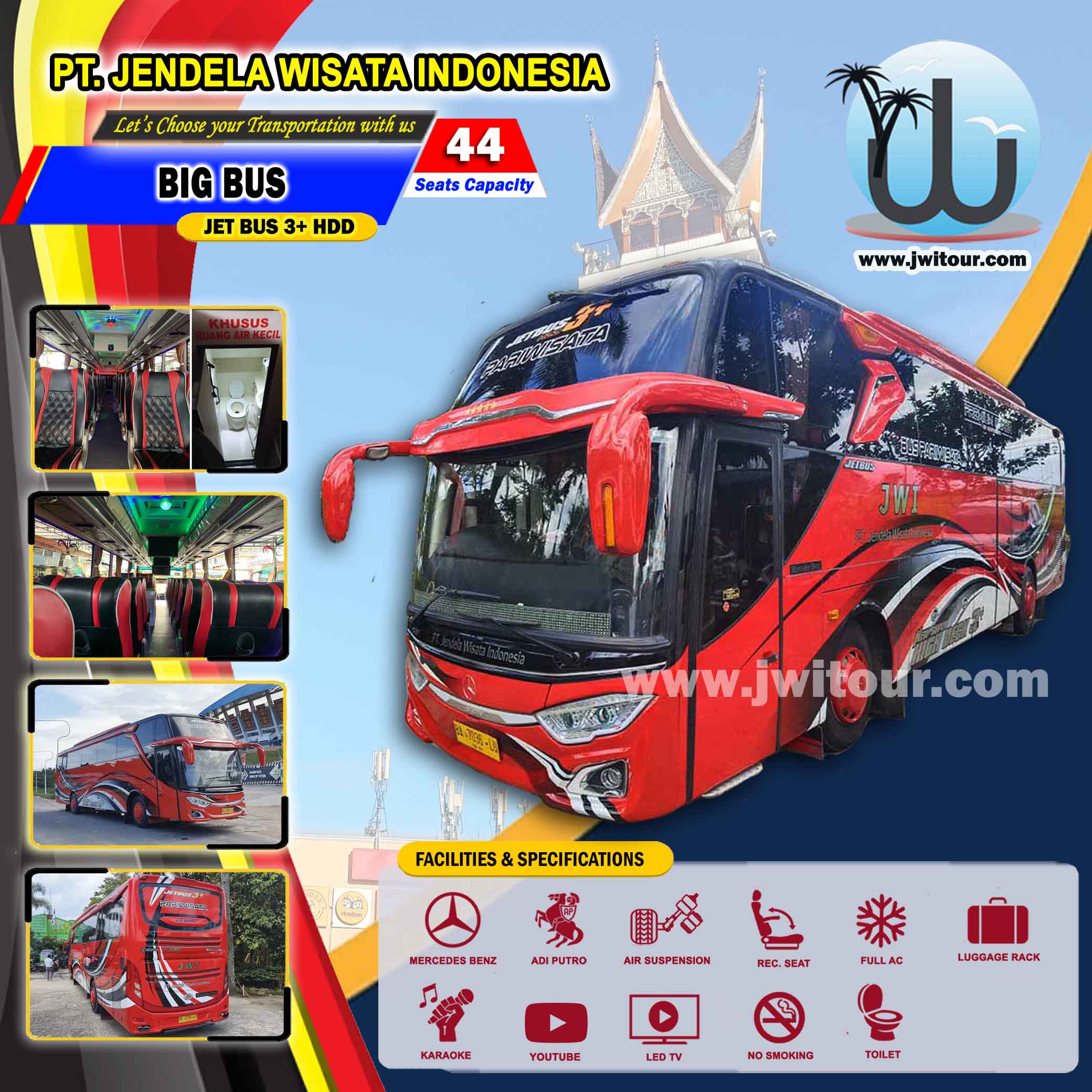 Big Bus JETBUS 3+ HDD berkapasitas 44 Seat, Armada ini dilengkapi dengan fasilitas standard Bus Pariwisata dan fasilitas tambahan seperti : Toilet di dalam Cabin Penumpang.