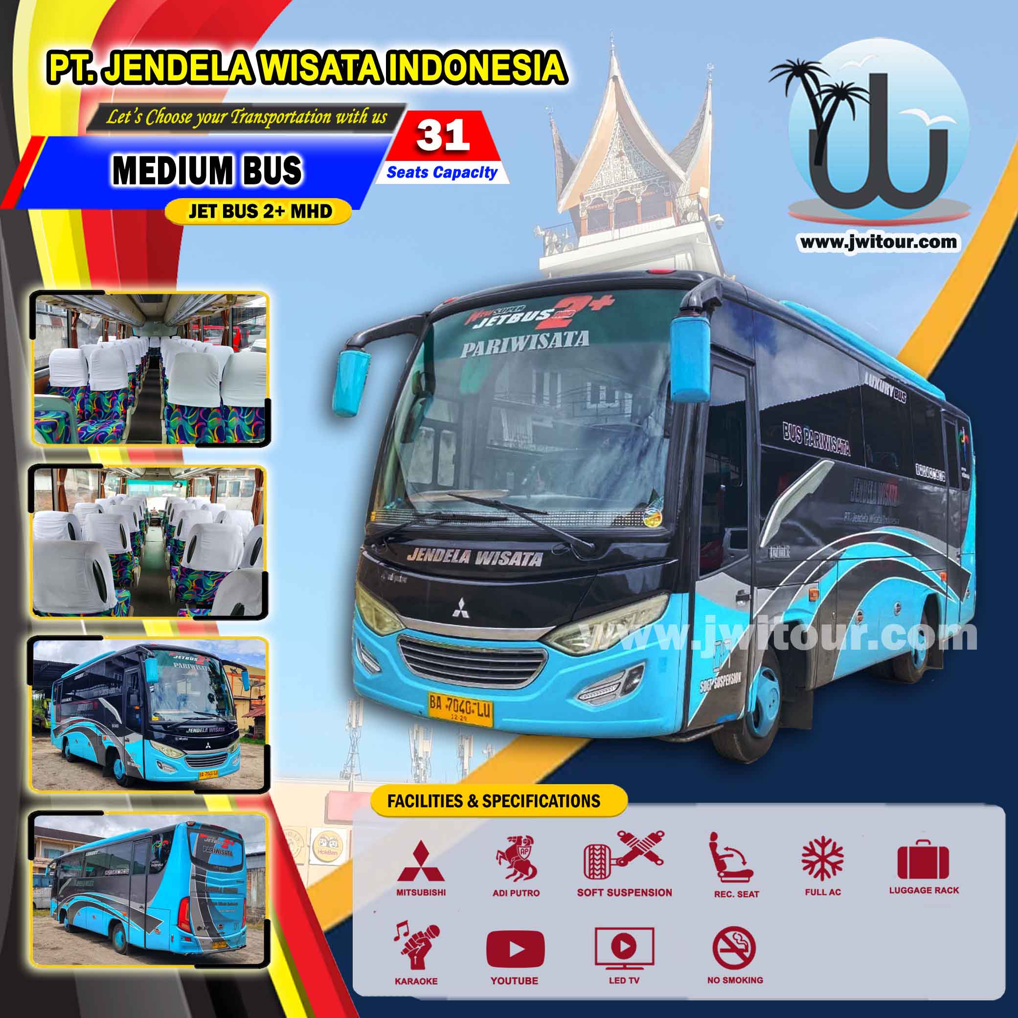 Medium Bus JETBUS 2+ MHD berkapasitas 31 Seat, cocok untuk anda dalam Jumlah Group Kecil maupun Group Menengah dan Armada ini dilengkapi dengan Fasilitas standard Bus Pariwisata sehingga membuat perjalanan wisata anda lebih berkesan.