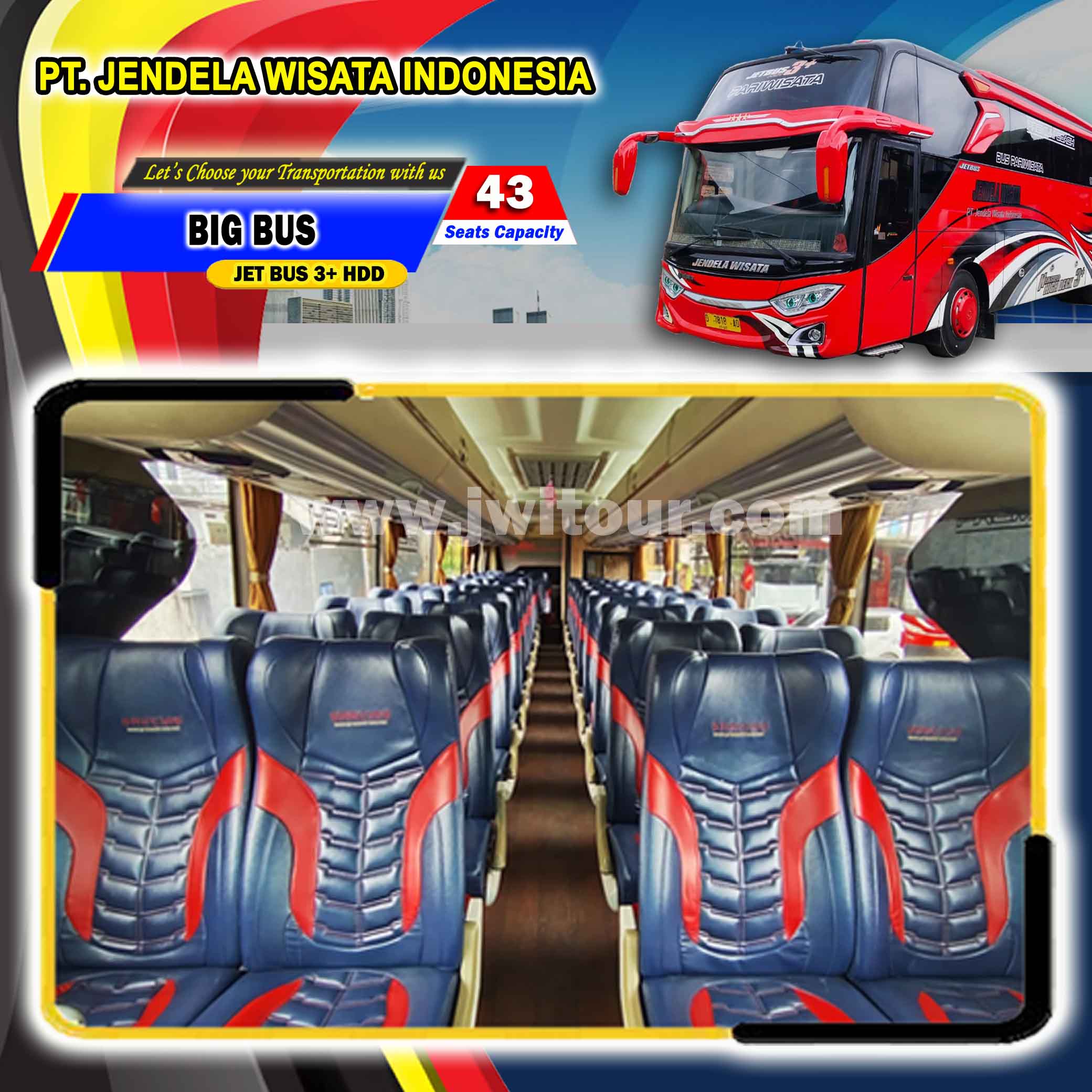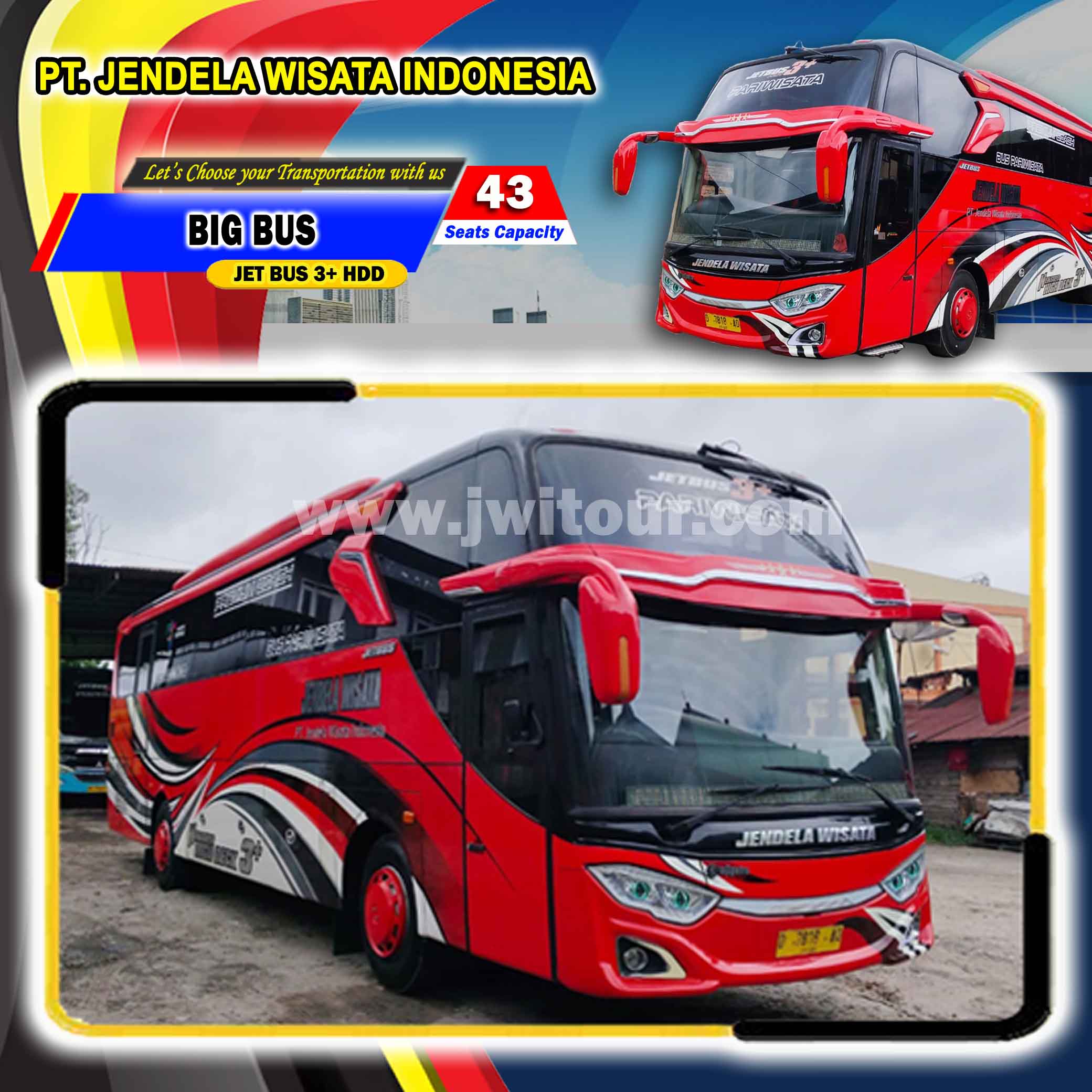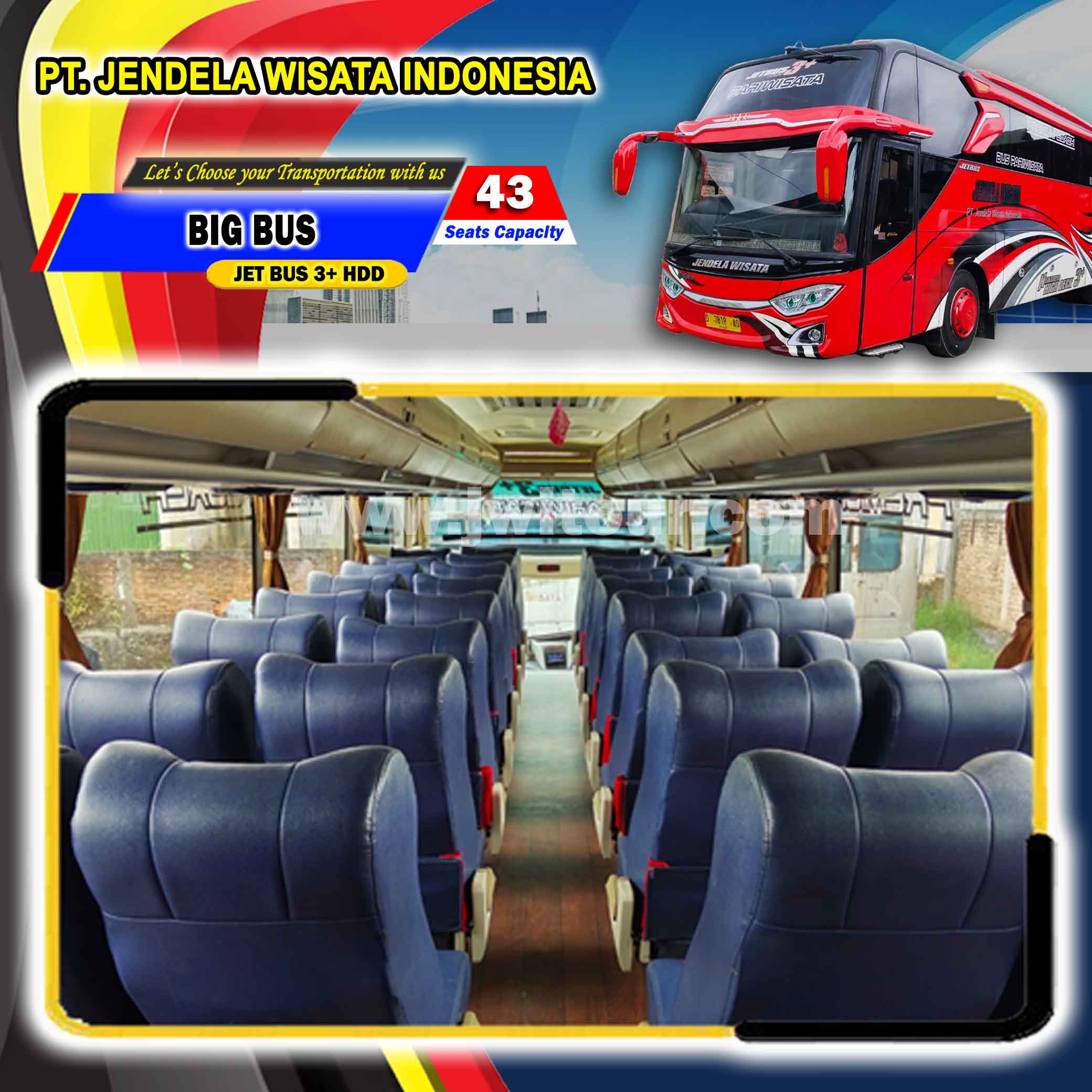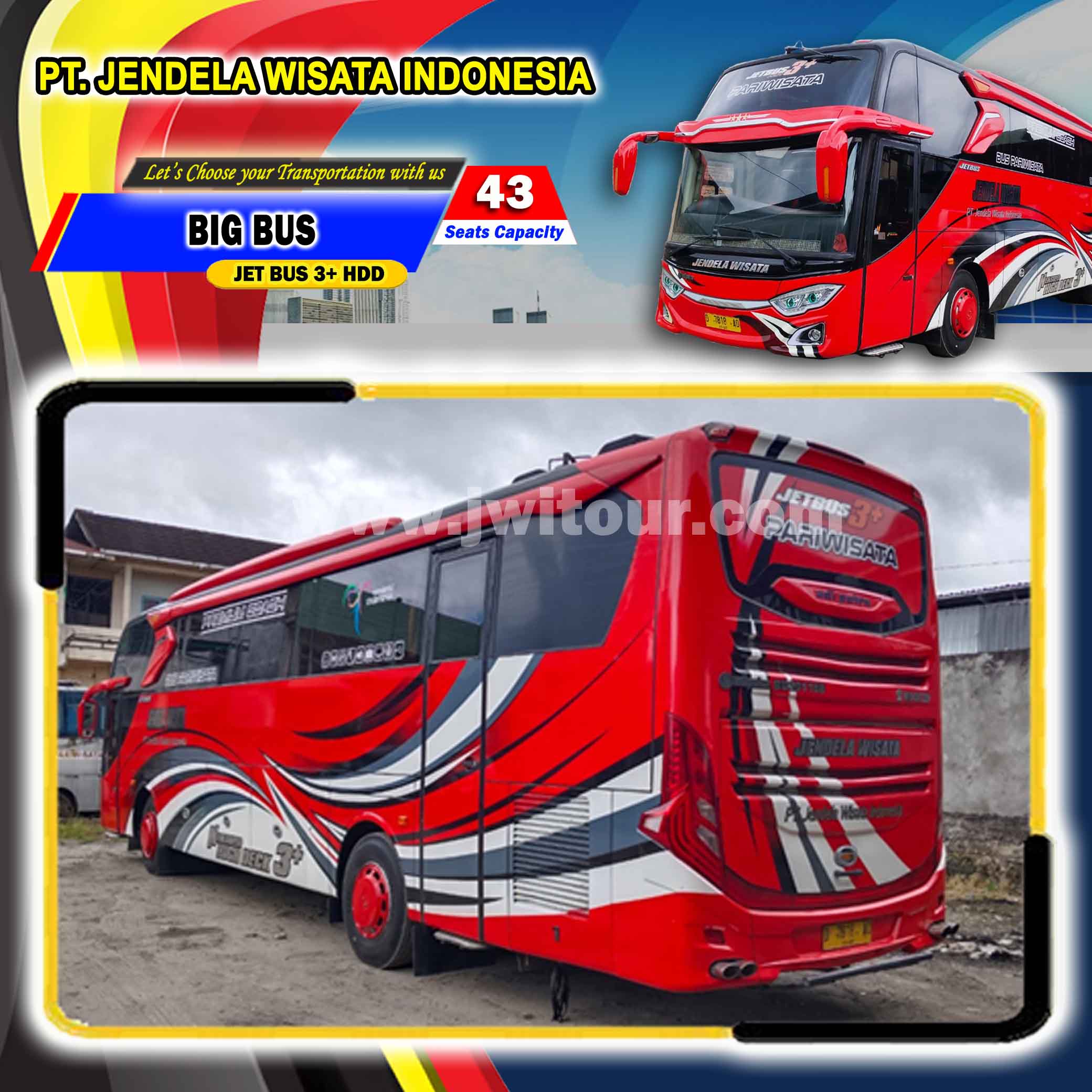 Big Bus JETBUS 3+ HDD dengan spesifikasi Hino dan berkaroseri Adi Putro. Tentunya berbekal dengan Fasilitas yang lengkap dan interior Bus terbaru, Armada ini juga dibekali dengan fasilitas tambahan Toilet dan Smoking room di dalam Cabin penumpang. Big Bus ini sangat nyaman untuk menemani perjalanan anda, baik di dalam maupun keluar kota dengan fasilitas bus yang lengkap serta ditemani oleh driver dan kru yang berpengalaman. Big bus pariwisata ini juga sangat cocok bagi anda yang akan melakukan perjalanan pariwisata dengan Jumlah Group sedang/menengah maupun group besar sehingga perjalanan anda menjadi lebih nyaman.
