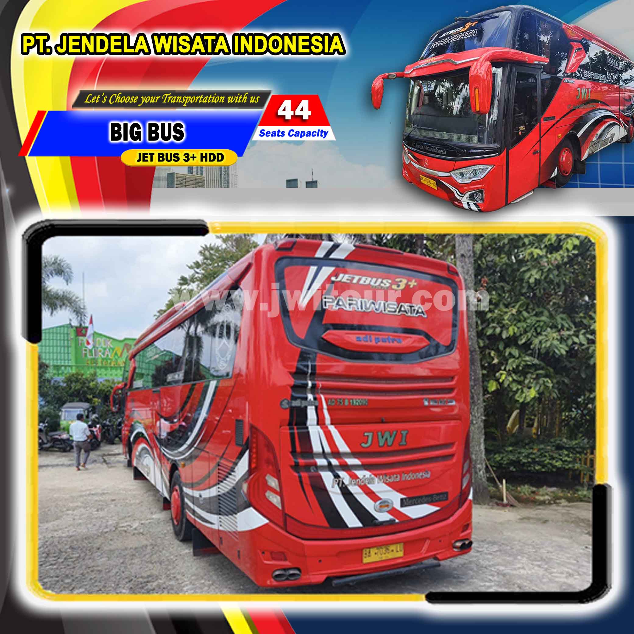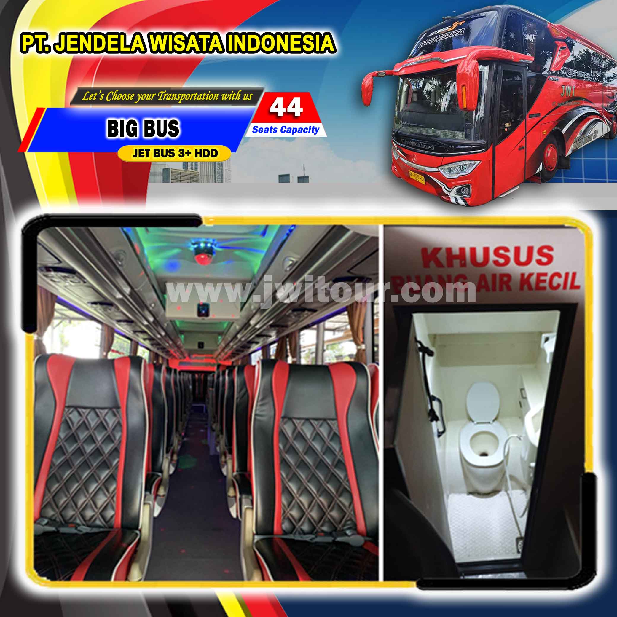 Big Bus JETBUS 3+ HDD dengan spesifikasi Mercedez Benz dan berkaroseri Adi Putro. Tentunya berbekal dengan Fasilitas yang lengkap dan interior Bus terbaru, Armada ini juga dibekali dengan fasilitas tambahan Toilet di dalam Cabin penumpang. Big Bus ini sangat nyaman untuk menemani perjalanan anda, baik di dalam maupun keluar kota dengan fasilitas bus yang lengkap serta ditemani oleh driver dan kru yang berpengalaman. Big bus pariwisata ini juga sangat cocok bagi anda yang akan melakukan perjalanan pariwisata dengan Jumlah Group sedang/menengah maupun group besar sehingga perjalanan anda menjadi lebih nyaman.