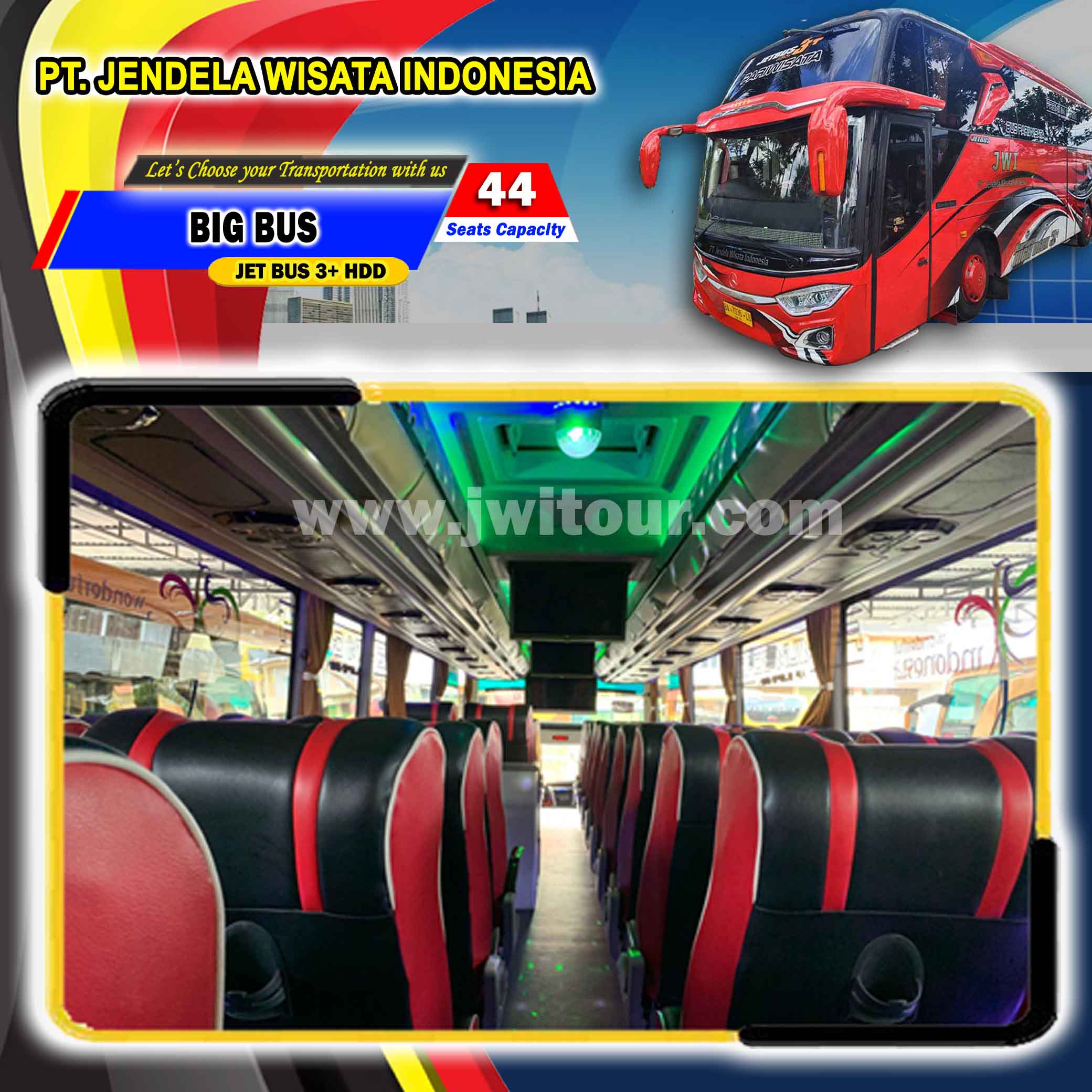 Big Bus ini memiliki kapasitas tempat duduk sebanyak 44 seats, dengan formasi tempat duduk 2 (dua) seat di sisi kiri, 2 (dua) seat di sisi kanan ( 2-2 ) serta 6 (enam) seat di barisan paling belakang