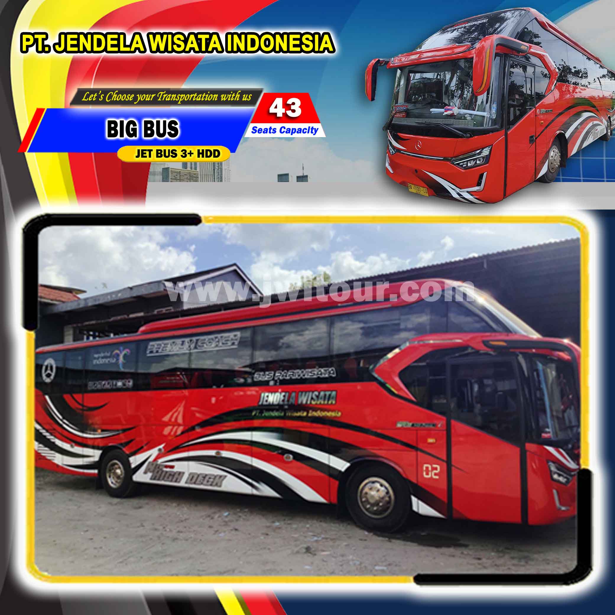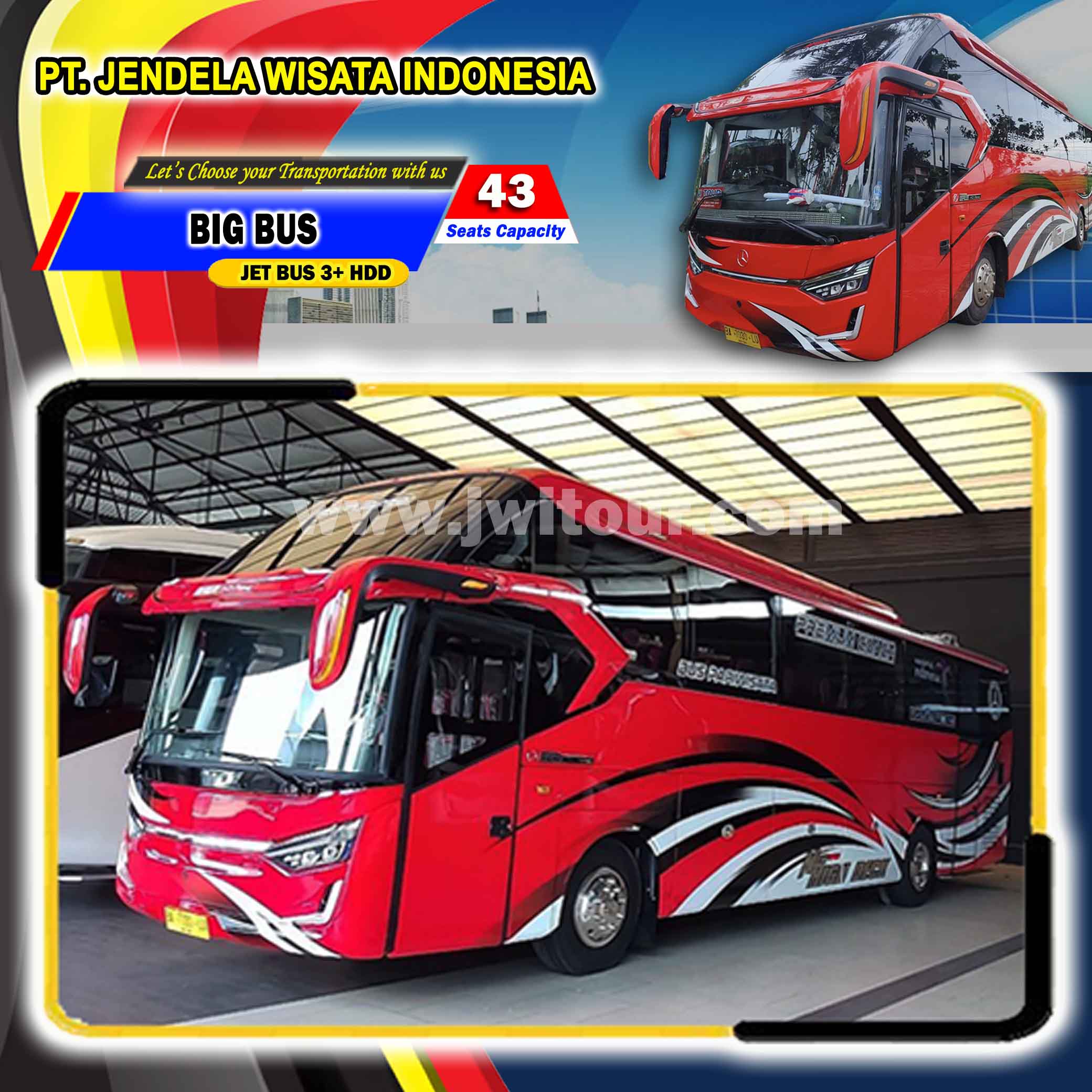 Big Bus JETBUS 3+ HDD dengan spesifikasi Hino dan berkaroseri Adi Putro. Tentunya berbekal dengan Fasilitas yang lengkap dan interior Bus terbaru, Armada ini juga dibekali dengan fasilitas tambahan Toilet di dalam Cabin penumpang. Big Bus ini sangat nyaman untuk menemani perjalanan anda, baik di dalam maupun keluar kota dengan fasilitas bus yang lengkap serta ditemani oleh driver dan kru yang berpengalaman. Big bus pariwisata ini juga sangat cocok bagi anda yang akan melakukan perjalanan pariwisata dengan Jumlah Group sedang/menengah maupun group besar sehingga perjalanan anda menjadi lebih nyaman.