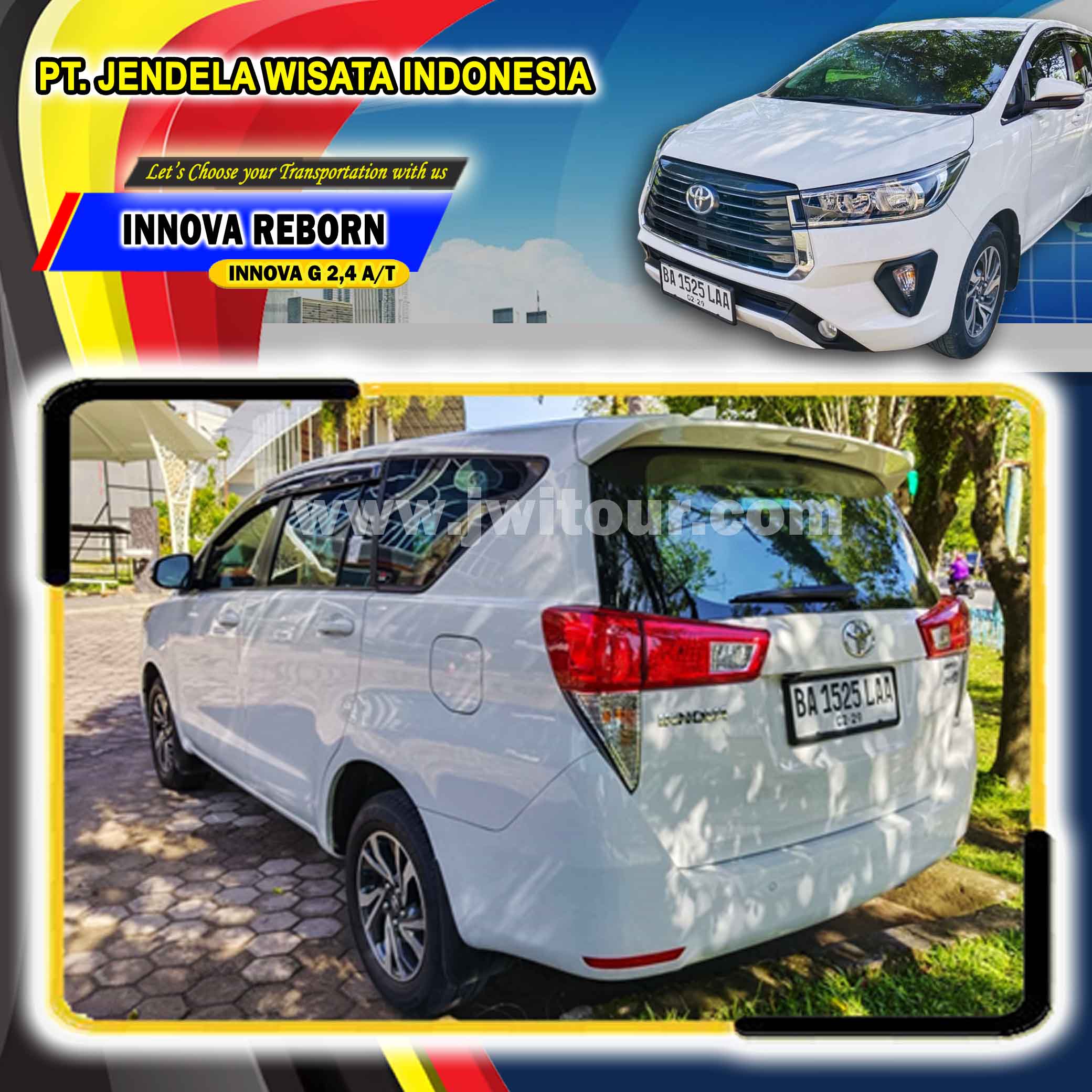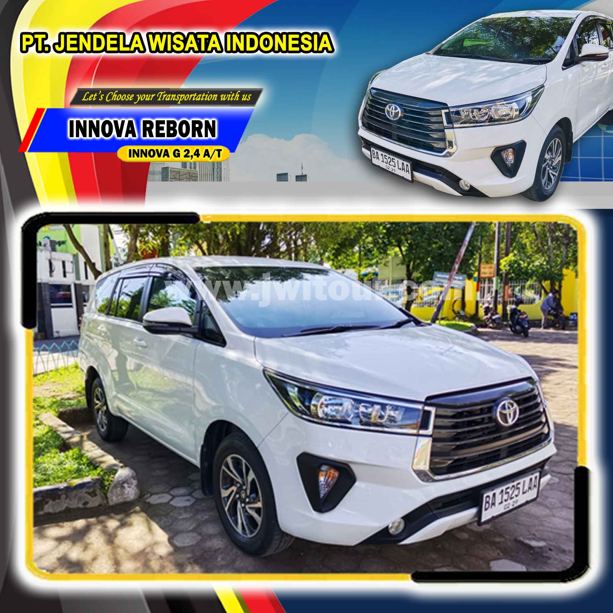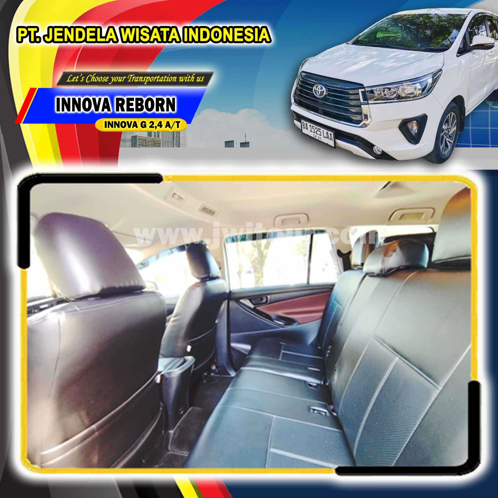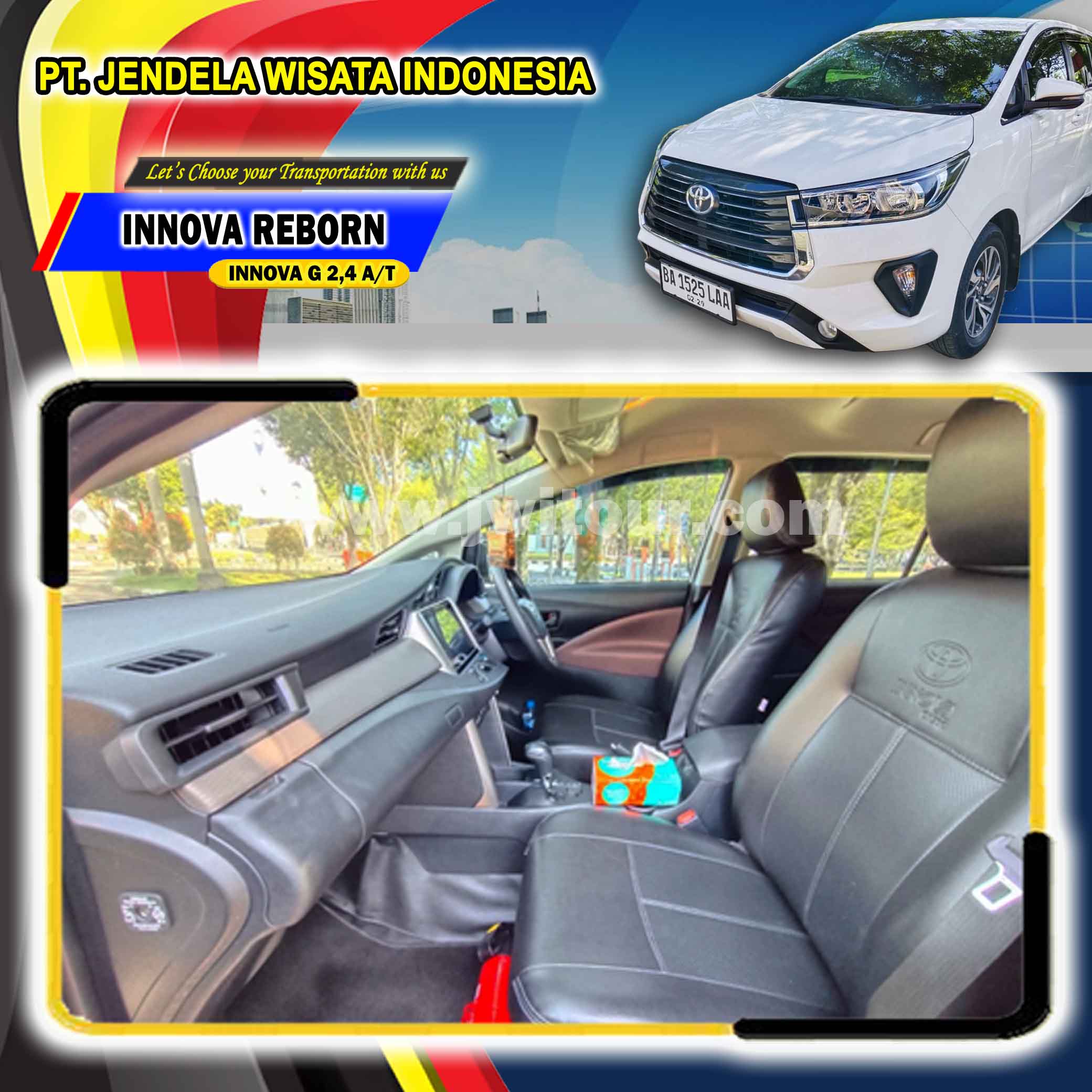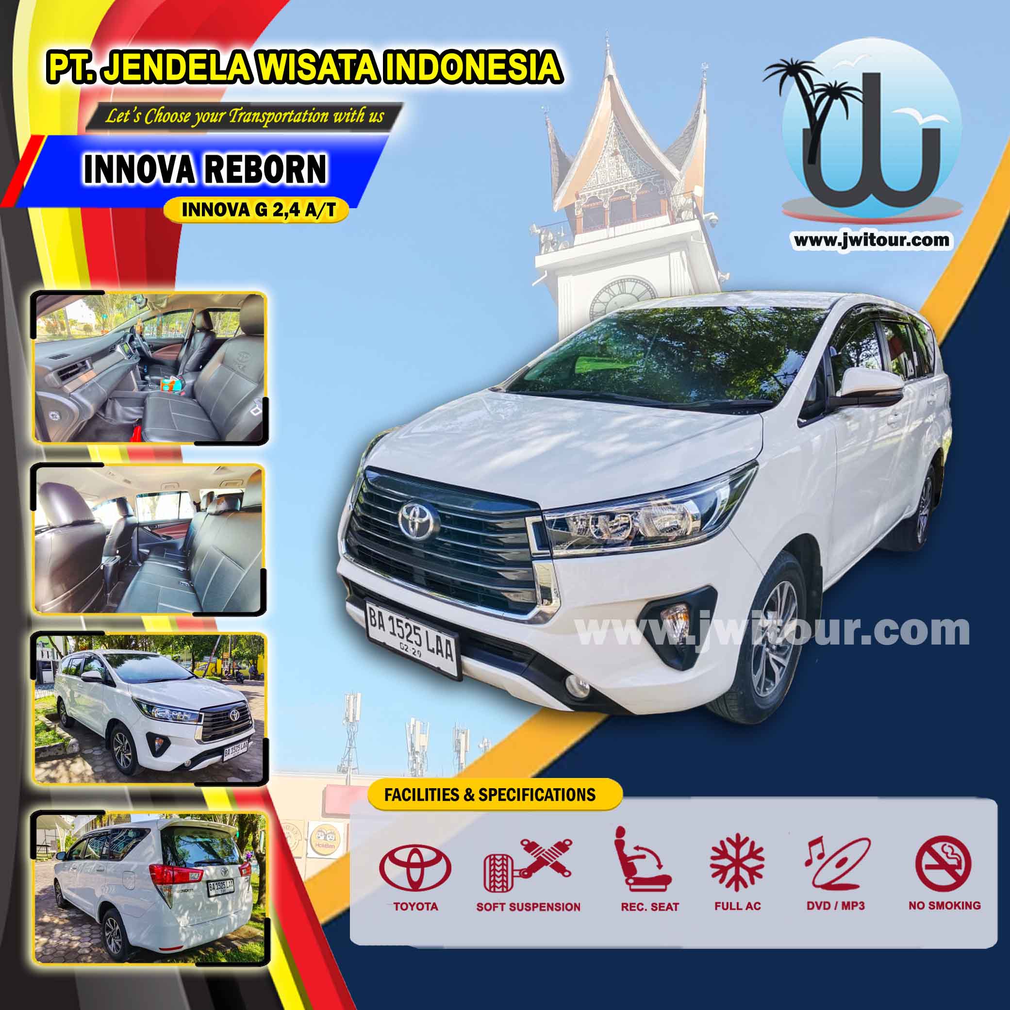 New Toyota Innova Reborn dengan mengandalkan mesin 2,4 A/T sudah bersertifikasi EURO 4. Armada ini memiliki Kabin yang cukup luas untuk anda dengan fotur keselamatan yang sudah dilengkapi oleh kontrol stabilitas kendaraan (VSC) sehingga kendaraan menjadi lebih stabil terutama ketika harus melewati jalanan dengan tikungan tajam sehingga dapat menghindari under dan over steering Toyota Innova Reborn menjadi pilihan tepat untuk anda yang akan melakukan perjalanan wisata dengan keluarga 2 – 4 orang ( Family Group / FIT ) maupun untuk perjalanan kunjungan bisnis dan lain sebagainya.
