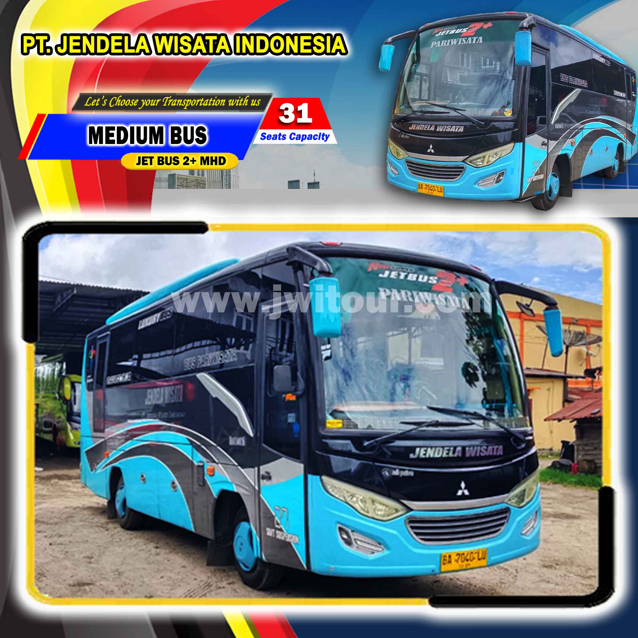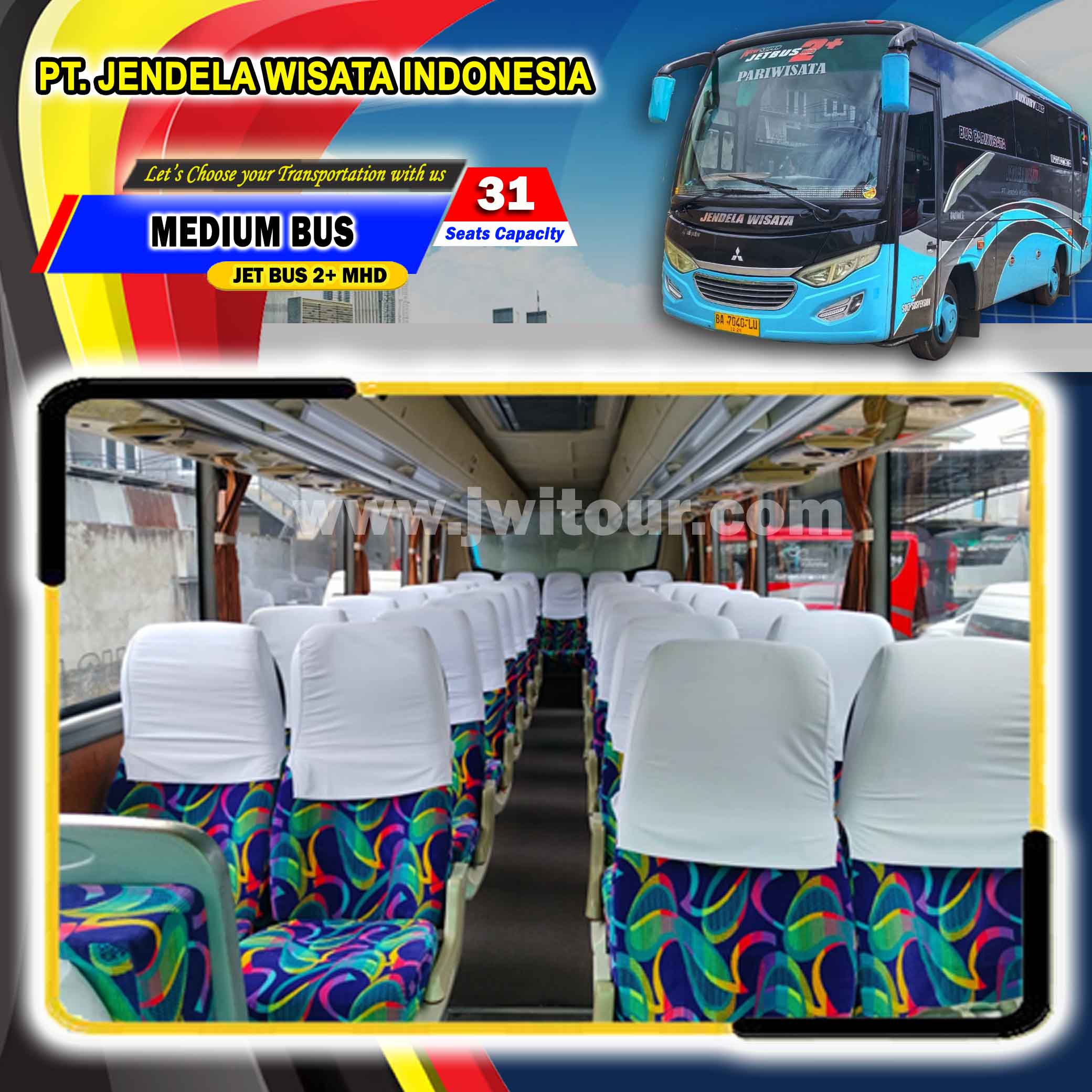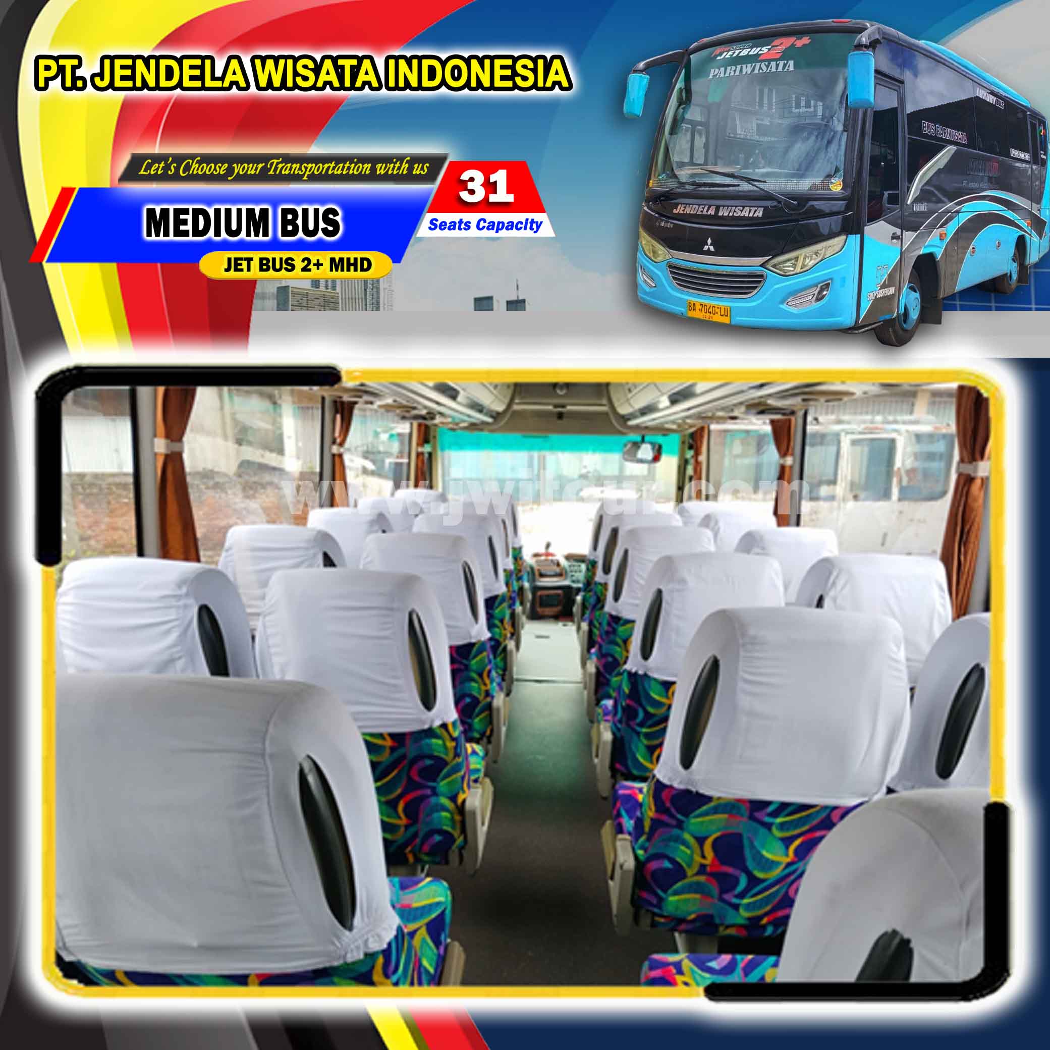 Medium Bus JETBUS 2+ MHD dengan spesifikasi Mitsubishi dan berkaroseri Adi Putro. Armada ini dilengkapi dengan fasilitas standard Bus Pariwisata sehingga menjadikan perjalanan wisata anda lebih berkesan. Medium Bus ini sangat nyaman untuk menemani perjalanan anda, baik di dalam maupun keluar kota dengan fasilitas bus yang lengkap serta ditemani oleh driver dan kru yang berpengalaman. Medium bus pariwisata ini juga sangat cocok bagi anda yang akan melakukan perjalanan pariwisata dengan Jumlah Group Kecil sampai dengan Group Menengah sehingga perjalanan anda menjadi lebih nyaman.